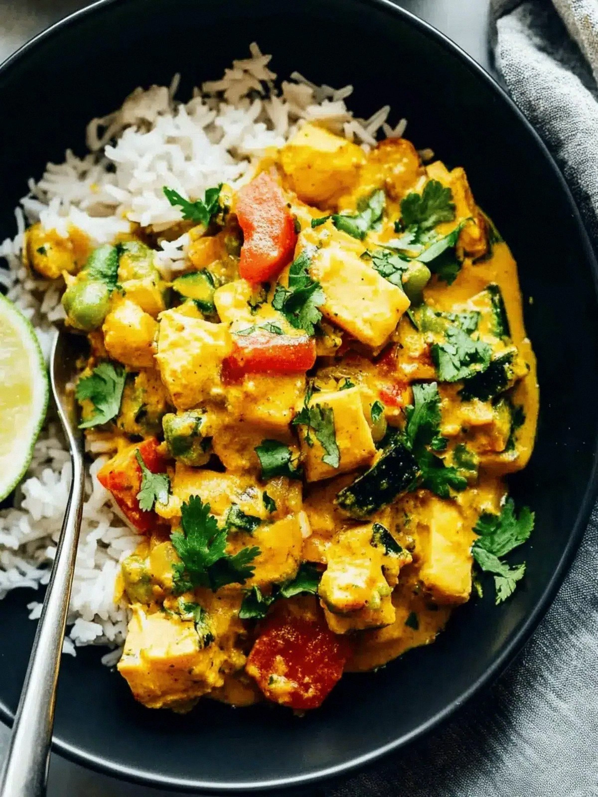 Use silken tofu instead of paneer and oat milk for the cream. The tofu soaks up the spices, and oat milk keeps the sauce creamy without dairy.