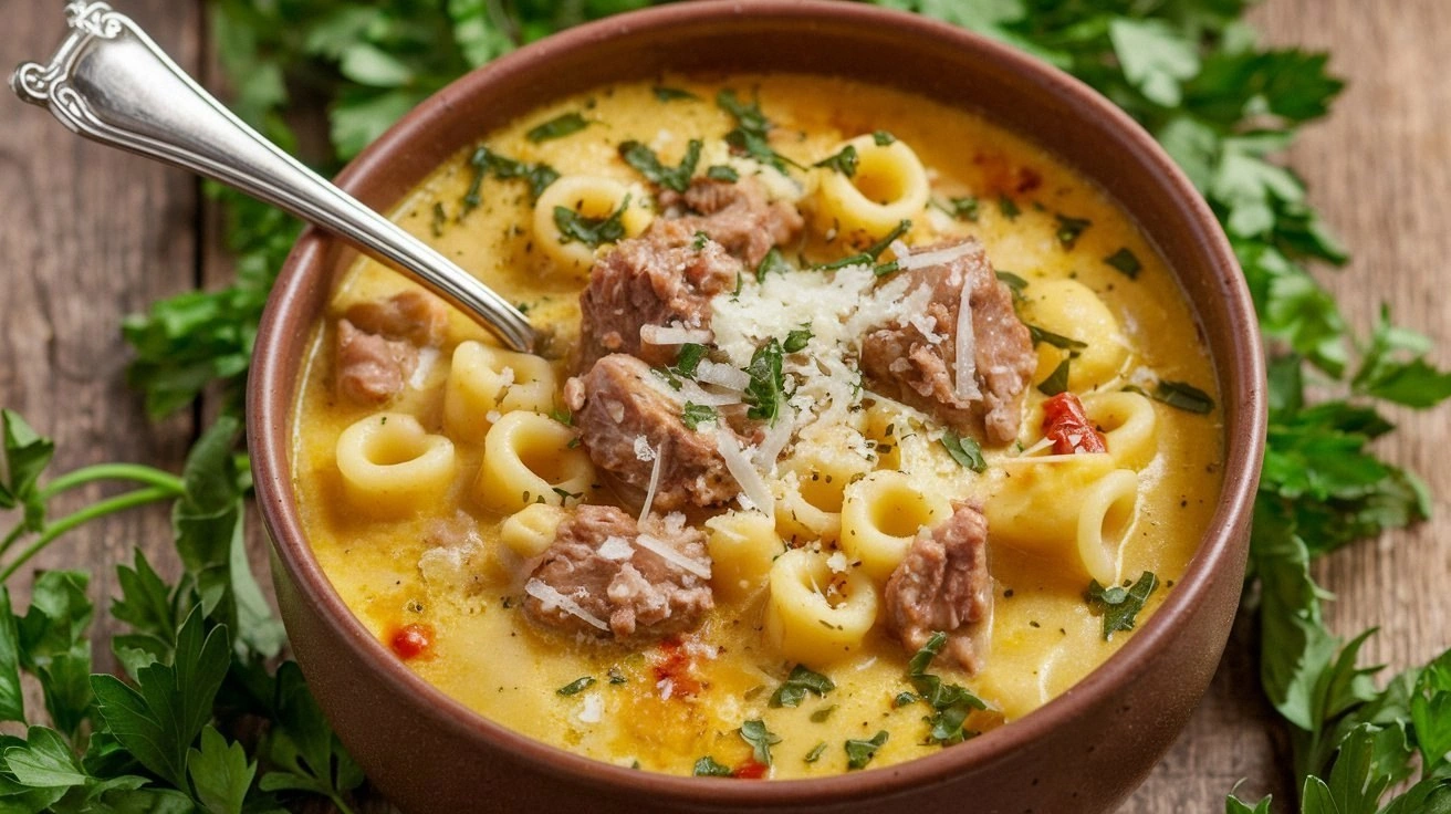 Use plant‑based sausage, oat or soy milk, and a vegan Parmesan alternative. This version retains the creamy texture while keeping it dairy‑free. The vegan cheese should be grated finely for smooth melting. The flavors remain rich, and the dish feels comforting. This variation is perfect for those who avoid dairy or meat. The result is a hearty, plant‑based soup that satisfies everyone.
